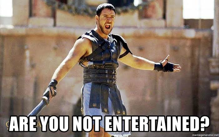 “Are you not entertained?” Roars a muscular Russell Crowe at the crowd being entertained by murder in a provincial Roman gladiatorial arena.